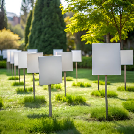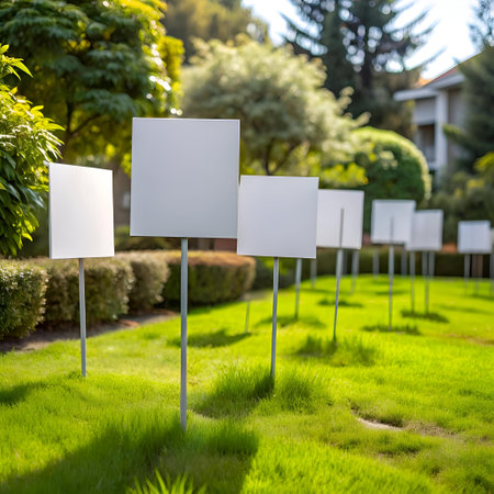 A row of blank white signs stand tall in a lush green lawn. ready for your message. Perfect for announcements. promotions. or showcasing your brand in a natural. inviting setting.
