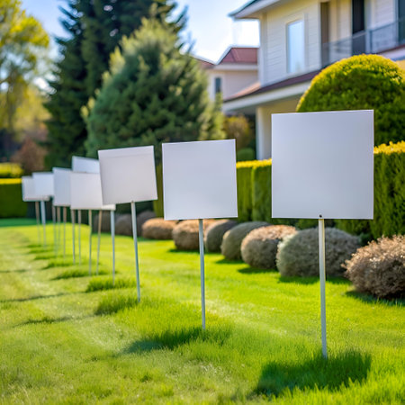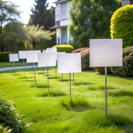 A row of blank white signs stand tall on metal poles in a lush green lawn. perfect for adding your own text or design. The signs are arranged in a neat row. offering a clean and professional look for any message.