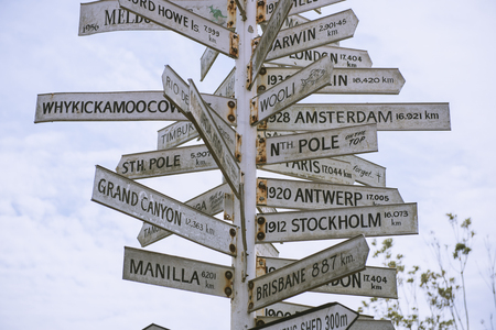 Distance sign situated at Stirling point at New Zealand