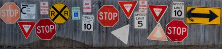 Collection of various road signs on rustic wooden wall