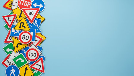 Various traffic and warning signs, including speed limits, turns, and stops, forming a vertical border on a light blue background, representing road rules and driver education