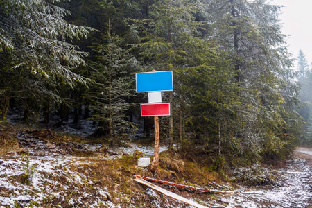 A wooden holds blue and red rectangular signs in a forest of tall evergreens. A narrow dirt path curves nearby, with light snow on the ground.
