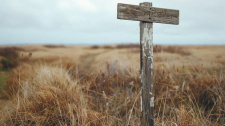 A wooden sign with a cross symbol and religious font, pointing right in a field under a sky. It blends art with natural landscape, resembling a twig in a cemetery AIG50