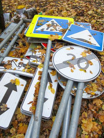 Autumn leaves cover piles of road signs and posts.