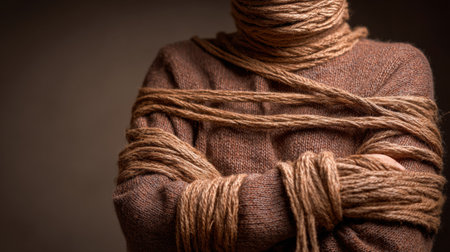 A person is wrapped in tangled rope, symbolizing mental limits and feelings of insecurity in a dimly lit indoor space.