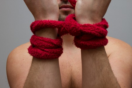 Woman hands tied together with a rope. Trafficking in persons, slavery, domestic violence. Concept