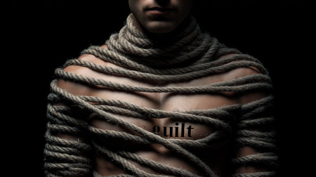 A person stands in darkness, bound by ropes that convey feelings of guilt and emotional weight