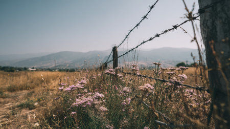 A close-up of wildflowers growing through a barbed wire fence, symbolizing the beauty of nature persistence against human constraints