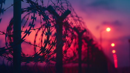Barbed wire stretches across the frame, silhouetted against a cloudy sky at dusk, evoking a sense of isolation and restriction in the background.