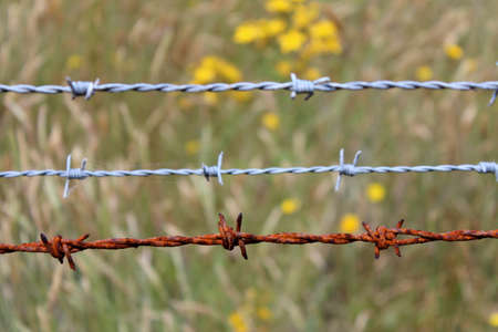 Rusty barbed wire fence on a meadow