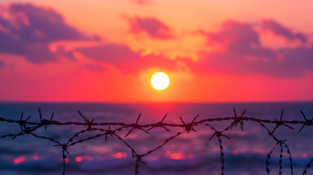 sunset, ocean, barbed wire, colorful sky, serene atmosphere, dramatic clouds A beautiful sunset scene with a vibrant orange sun setting on the horizon above the ocean, framed by barbed wire