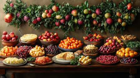 A stunning top view of a table filled with vibrant fresh fruits and gourmet delicacies, perfect for a lavish dining experience or celebration.