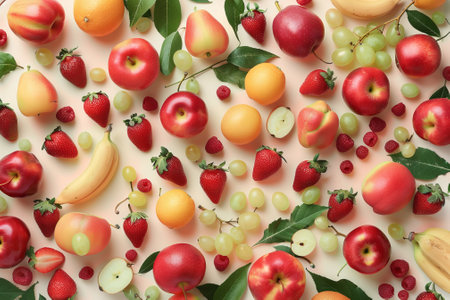 A close up of a variety of fruits including apples, grapes, and strawberries. Concept of abundance and freshness, with the fruits arranged in a visually appealing manner