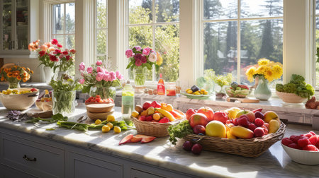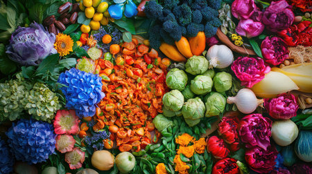 inspiring photo of fresh fruits, vegetables and herbs arranged in unique way, created with generative ai