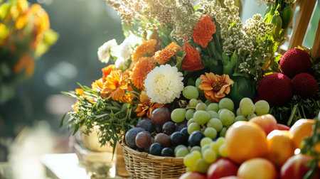 A stunning arrangement showcases an assortment of fresh fruits including apples, grapes, and citrus nestled among colorful garden flowers.