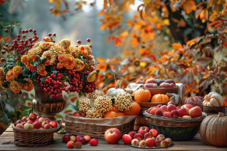 Autumn Harvest Display with Apples, Pumpkins, and Vibrant Flowers in a Rustic Outdoor Setting.