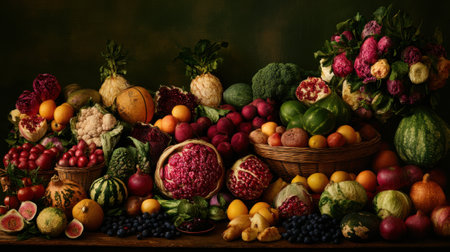 A stunning arrangement of diverse fruits and vegetables, showcasing vivid colors and textures, perfect for health, culinary art, or fresh food inspiration.