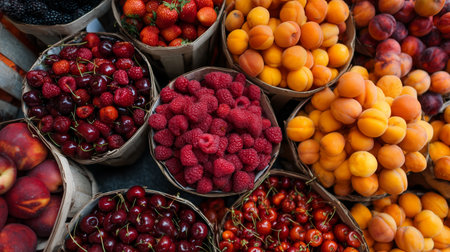 A close up of a variety of fruits including strawberries, blueberries, and peaches. Concept of abundance and freshness, as the fruits are piled high and in close proximity to one another