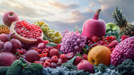 An abundant assortment of fresh, exotic fruits fills the scene, showing a vibrant blend of colors. The collection includes pineapples, grapes, oranges, and various berries, all intricately arranged against a lively backdrop of nature. This visually captivating display highlights the beauty of organic produce.