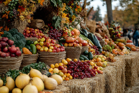 Generative AI Image Fruits and Vegetables on Straw for a Bazaar Festival Wallpaper