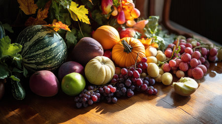 A variety of fruits and vegetables arranged on a wooden table, celebrating the harvest season.