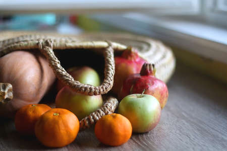 Straw tote bag filled with butternut squash and various fruit. Selective focus.