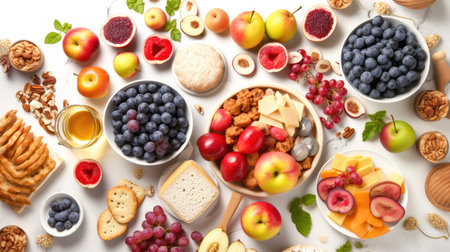 Healthy Food Ingredients on White Marble Background with Fruits, Nuts, Seeds, and Cheese. celebration of Jewish New Year Rosh Hashanah.