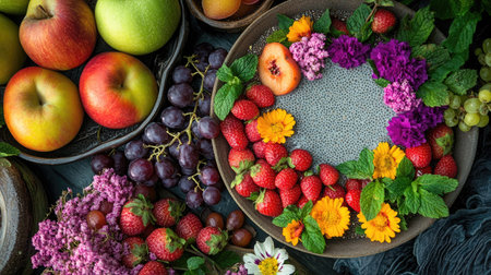 A delightful display of chia seed pudding with a variety of colorful fruit toppings, mint leaves, and flowers, beside a bowl of apples and grapes. Concept: Chia Seed Pudding, Colorful Fruit, Fresh Mint Garnish