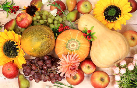 Thanksgiving, autumn background with seasonal nature fall berries, watermelons, melons, wheat, apples and flowers on wooden background, top view, copy space, flat lay. Happy Thanksgiving concept, selective focus.