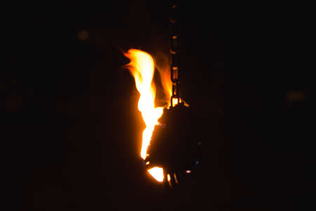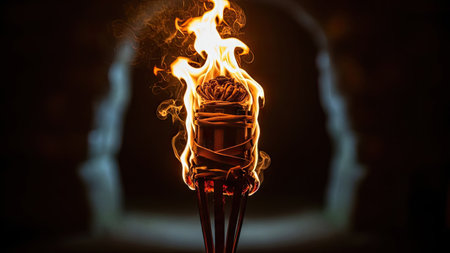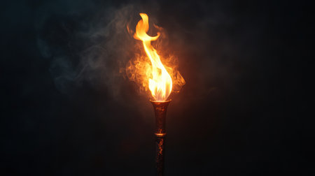 A burning torch with a vivid flame glowing brightly in the darkness, symbolizing light, warmth, and tradition.
