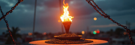 Eternal flame burning brightly outdoors at dusk amidst chains and city lights. That the image is generated using AI.