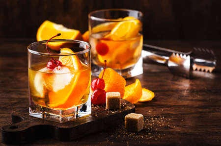 Old fashioned cocktail with bourbon, cane sugar, orange slice, cherry and orange peel garnish, vintage wood table, copy space