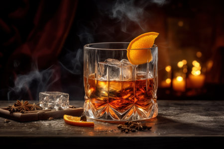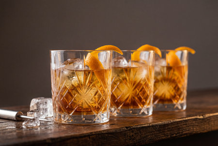 Close-up of whiskey cocktails served in crystal glasses with orange slices and ice cubes. The warm and inviting setup emphasizes themes of celebration and relaxation.