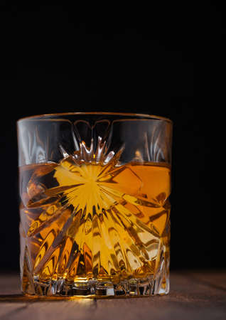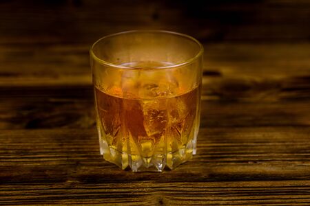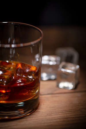 Single malt scotch whiskey in crystal glass with ice cubes on wooden table background. Macro