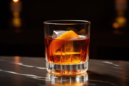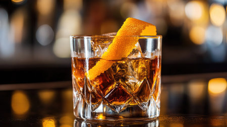 A classic old-fashioned cocktail with an orange twist and cherry, on a polished bar top with elegant lighting.