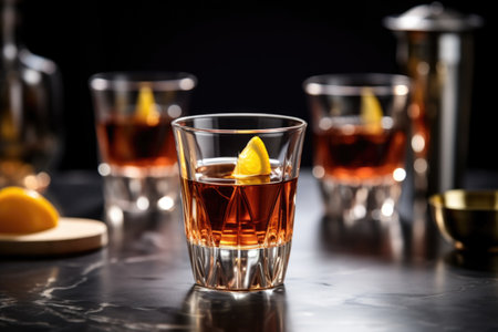 manhattan cocktail near classy cocktail glasses, created with generative ai