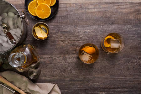 Old Fashioned - classic alcoholic cocktail with bourbon whiskey, bitter, cane sugar and ice in retro glasses on vintage bar counter, place for text