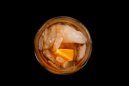 Drinking whiskey with ice enhances the oak barrel flavor Close up of an alcoholic drink with ice lik