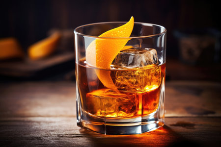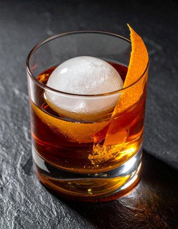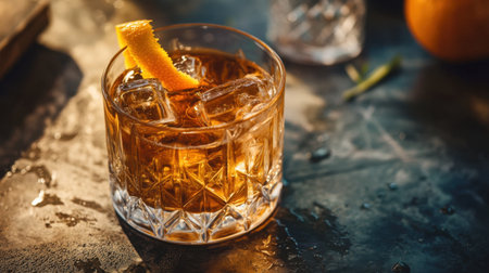 Close-up of a classic Old Fashioned cocktail with orange peel