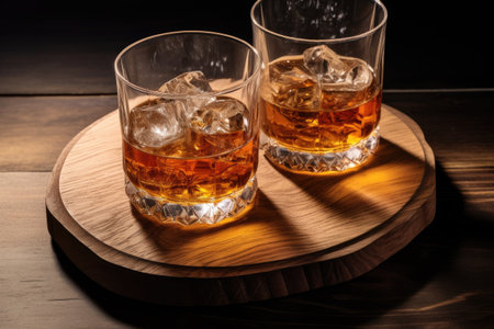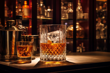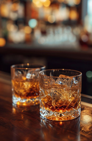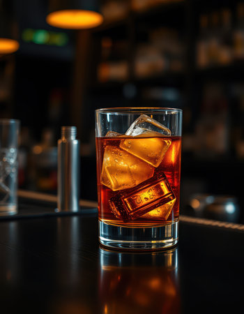 Sophisticated crystal whiskey glass with ice on a dark wood bar, ambient lighting