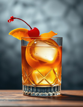 Classic cocktail with cherry and orange garnish served over ice in a stylish glass at a dimly lit bar