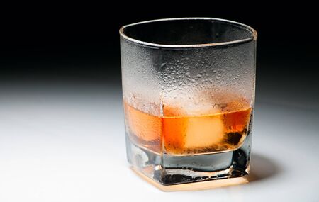 Closeup misted cold glass of whiskey on gradient background