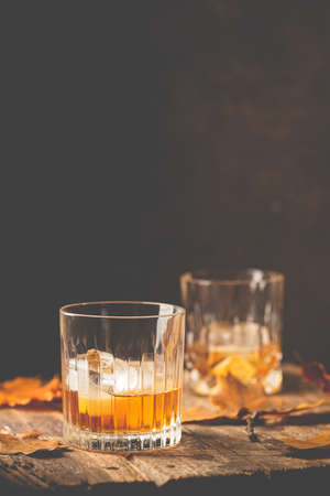 Glass of scotch whiskey and ice on wooden background with autumn leaves