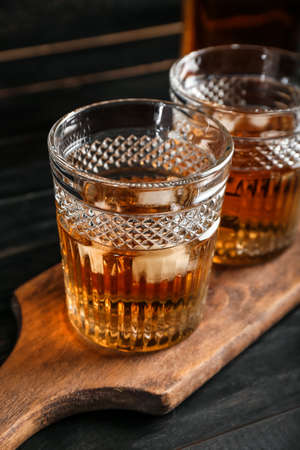 Glasses of cold whiskey on dark wooden background