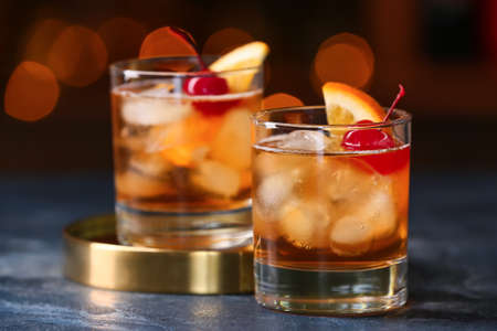 Glasses of tasty Old Fashioned Cocktail on table in bar