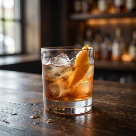 A perfectly crafted Old Fashioned cocktail sits on a rustic wooden bar, garnished with a vibrant orange peel. The warm, blurred background creates a sophisticated, cozy ambiance.