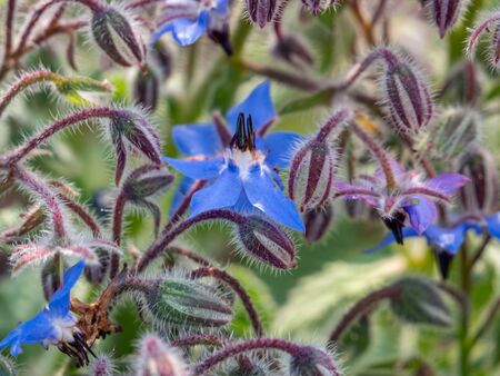 Blue blossoms of starflower (Borago officinalis) Mediterranean herb, the flowers produce copious nectar while blooming and are attractive for bees, blurry background, selected focus, narrow depth of field