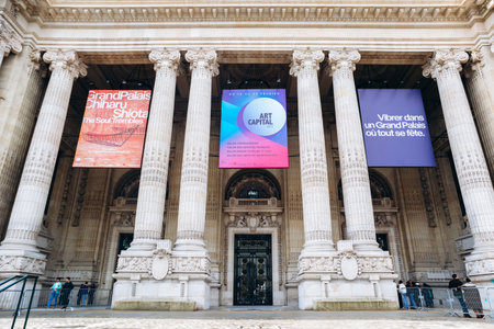 Paris, France - February 22, 2025: Facade of the Grand Palais and exhibition poster for Art Capital 2025, showcasing historical art events.