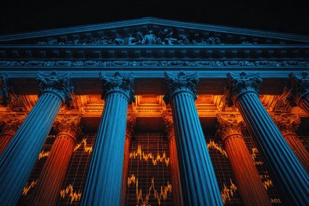 This striking image captures the harmony of classical pillars and modern design, showcasing elegant lines and a warm glow in an urban setting. Perfect for architectural themes.