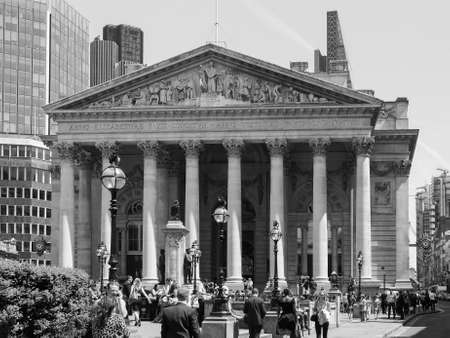 LONDON, UK - JUNE 11, 2015: People in front of The Royal Stock Exchange in black and white